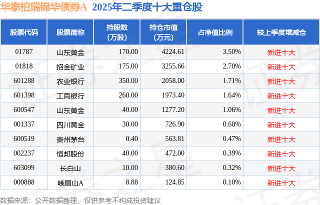 华泰柏瑞锦华债券A的前十大重仓股如下: