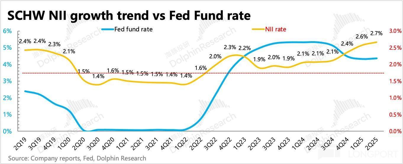 总的来说,一般情况下,加息环境仍然更有利于嘉信的息差净收入,降息环境稍显不利。但若利息变动后期,对利息收入的影响会反向,即高息环境久了会压制净利息收入,低息环境久了会对净利息收入产生正向拉动。