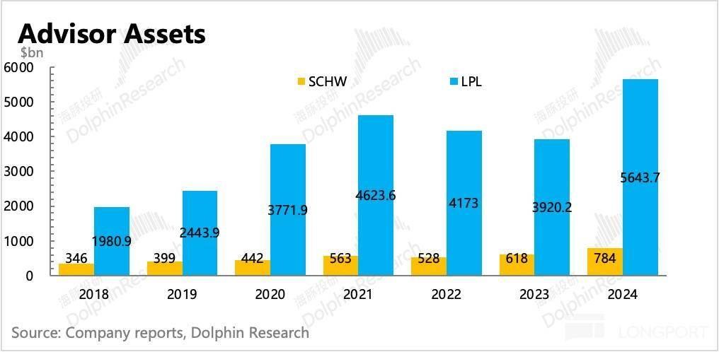 截至 2024 年,LPL 拥有近 2.9 万名个人投顾,服务资产规模 9570 亿;而嘉信拥有 1000 多名自有投顾,和 9000 多个外部 RIA 机构(大多为低于 5 名投顾的小机构),合计服务客户资产规模 5.6 万亿。简单直观比较,LPL 投顾单人平均管理资产的规模量级(约 3000 美元)要明显低于嘉信(1P+3P 合计来看,约 12000 美元)。