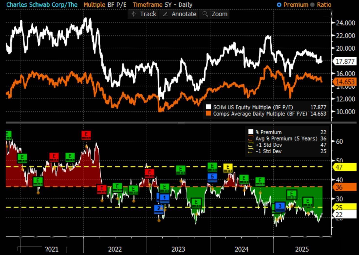 这可能表明市场对嘉信应对流动性管理能力和产品创新能力的产生了一些疑虑,但目前来看,完成收购重组并准备重新找回 “创新” 的嘉信,或许能够在度过短期降息窗口期,消化一些看淡情绪后,有望随着加密货币交易平台等新产品的推出,回到往昔的估值高度。
