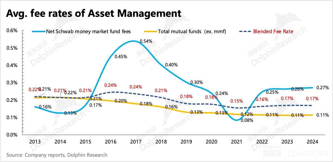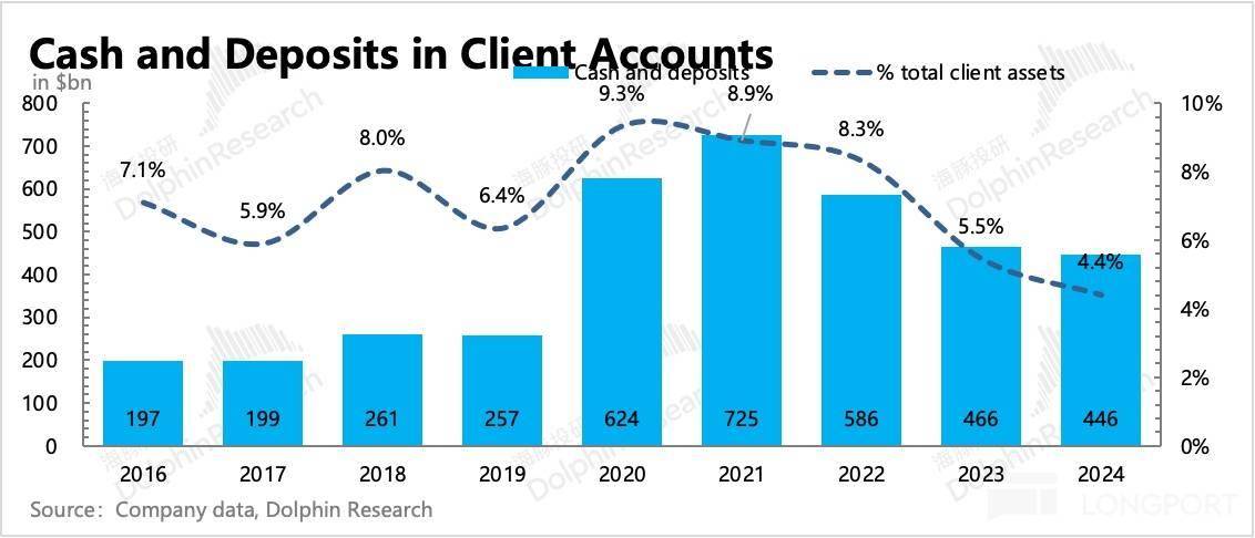 但聚沙成塔,在乘以千万账户的 “规模倍数” 后,对于嘉信来说则是一笔金额庞大的集体存款。以 2024 年为例,客户资产中现金存款总规模有 4500 亿,息差每扩大 100 个基点,对嘉信而言就是 45 亿的纯利净增。