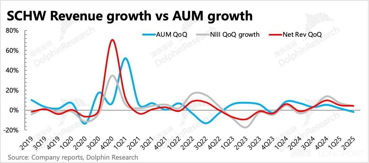 换句话说,尽管利息周期会带来短期扰动,但长期视角下,净息差增长的核心驱动还是客户总资产 AUM。利息业务如此,那就更不用说本身就与 AUM 直接关联的交易收入和财富管理收入了。
