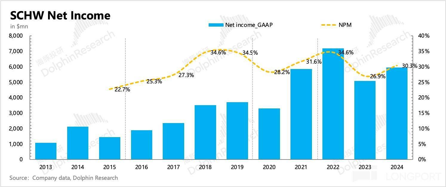 对比 Robinhood 和 LPL,目前嘉信的主要优势就是在客户资产规模的绝对体量上,这个 “规模效应” 弥补了嘉信在用户资产增速慢、变现效率低上的劣势,从最终利润增速和盈利能力上,嘉信表现反而不俗。