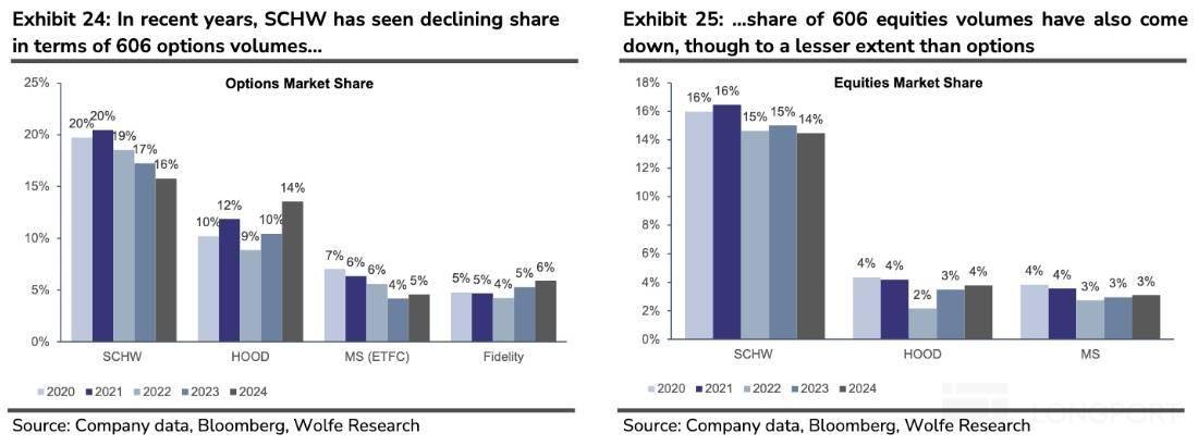 其中丰富衍生品、加密货币等方向的可交易资产品种是嘉信接下来一年窗口期内的主要动作。过去几年,嘉信期权交易份额显著下降,已经被 Robinhood 迅速蚕食。而 Robinhood 2024 年吃尽红利的加密资产,在嘉信平台还不能直接交易,只能通过加密货币公司 ETF(2022 年推出,主要投资于加密货币概念的上市公司,而非加密货币资产)实现间接投资。