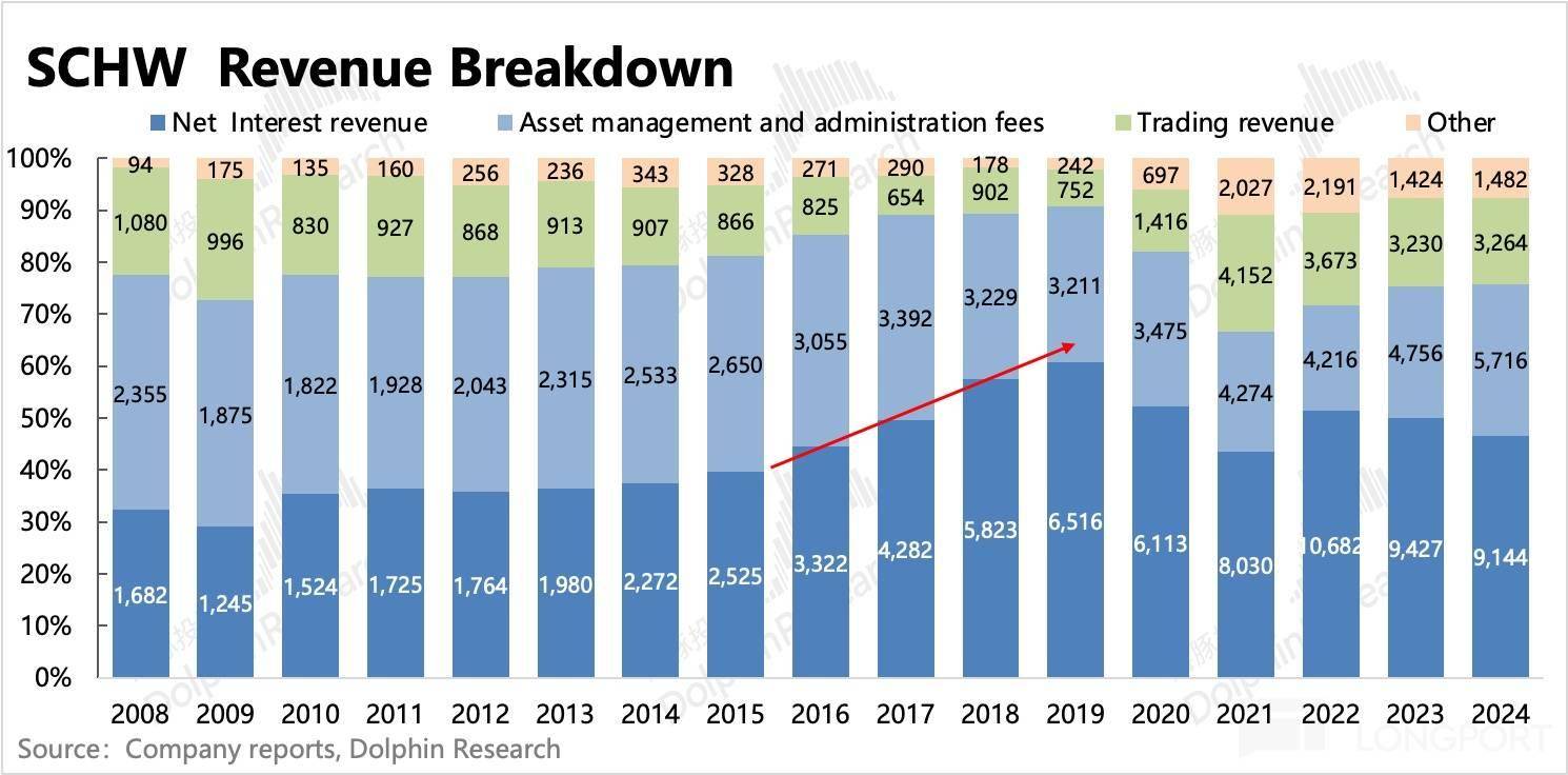 同时,转型的痕迹也体现到了实际业绩中,分别对应着收入增长主力,从零售交易(佣金、订单流收入)切换到财富管理(基金管理费、咨询费、RIA 托管收入)。再然后,随着 2016 年加息周期开启,息差创收(存、贷款利息/投资收益)很快超越财富管理,正式接过第一增长大旗。