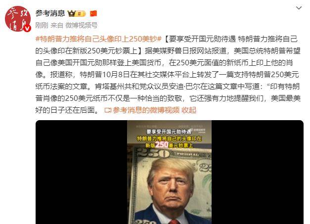报道称,特朗普10月8日在其社交媒体平台上转发了一篇支持特朗普250美元纸币法案的文章。肯塔基州共和党众议员安迪·巴尔在这篇文章中写道:印有特朗普肖像的250美元纸币不仅是一种恰当的致敬,它还强有力地提醒我们,美国最美好的日子还在后面。