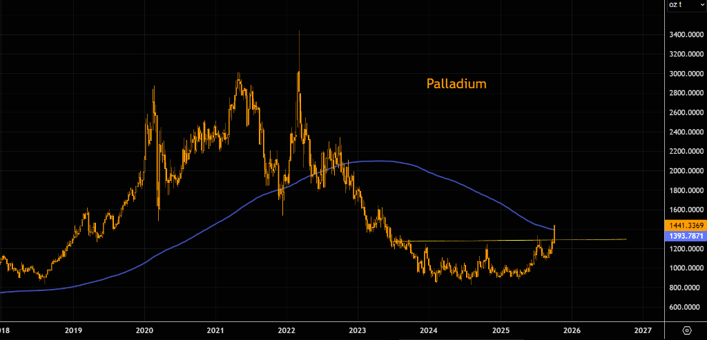 在过去一个月里,钯金价格上涨超过20%,涨幅超过了黄金的11%和白银的近17%。尽管目前的价格仍不到其历史高点3400美元的一半,但其年内近49%的涨幅,几乎与黄金的表现相当。