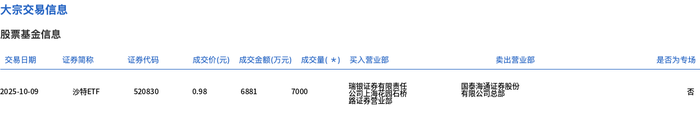 10月9日,沙特ETF大宗交易成交7000万股,成交额6881万元,占当日总成交额的34.26%,成交价0.98元,较市场收盘价0.983元折价0.31%。