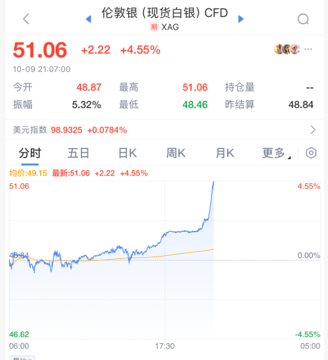现货白银日内突破每盎司50美元,创20世纪80年代“亨特兄弟逼仓”以来最高水平。之后呈加速上涨之势,突破50美元整数大关后继续上攻51美元/盎司关口,涨幅扩大至4.5%,报51.06美元/盎司,继续创新高。