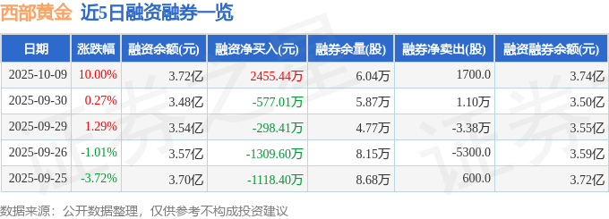 证券之星消息,截至2025年10月9日收盘,西部黄金(601069)报收于32.89元,上涨10.0%,涨停,换手率6.84%,成交量60.68万手,成交额19.39亿元。