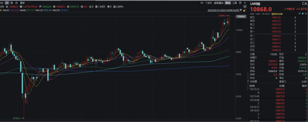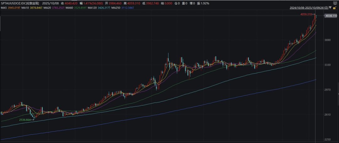 在众多消息刺激下,国庆期间黄金价格持续上涨。10月8日一度冲破4059美元/盎司,创下历史新高。