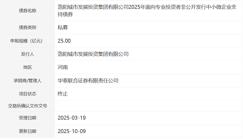 【大河财立方消息】10月9日,洛阳城市发展投资集团有限公司2025年面向专业投资者非公开发行中小微企业支持债券,项目状态变更为“终止”。