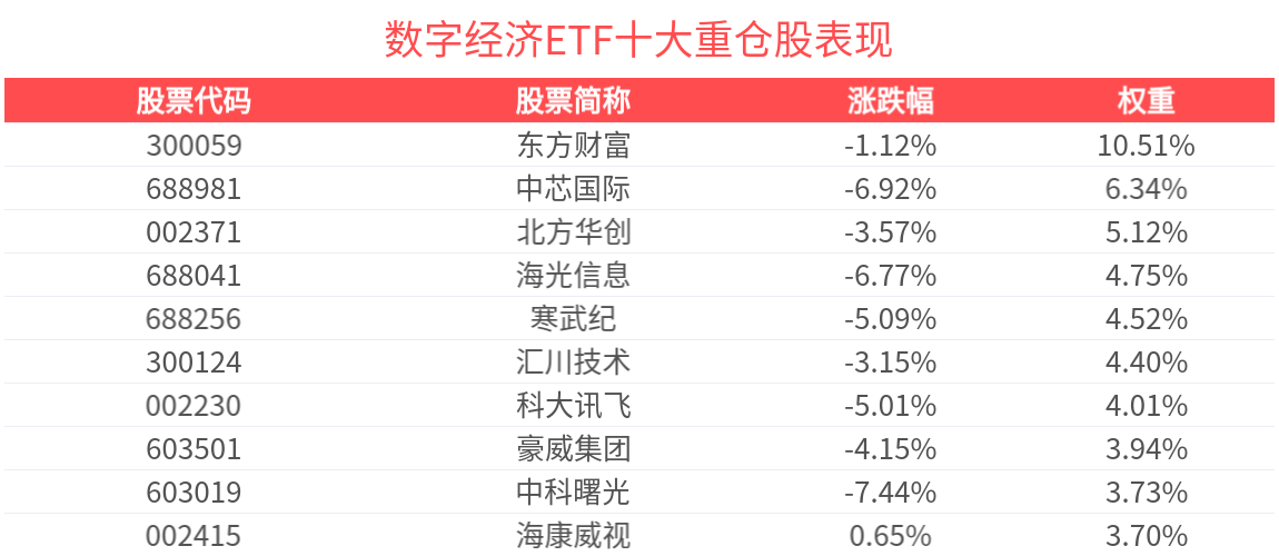 据Wind数据显示,截至2025年9月30日,中证数字经济主题指数(931582)前十大权重股分别为东方财富(300059)、中芯国际(688981)、寒武纪(688256)、海光信息(688041)、北方华创(002371)、澜起科技(688008)、中科曙光(603019)、汇川技术(300124)、兆易创新(603986)、中微公司(688012),前十大权重股合计占比54.31%。
