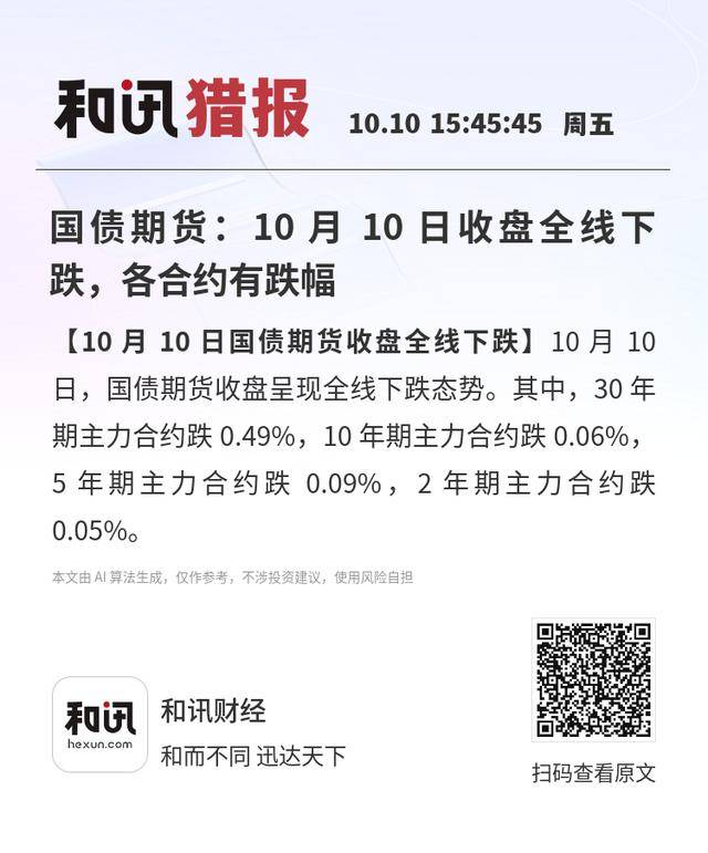 【10 月 10 日国债期货收盘全线下跌】10 月 10 日,国债期货收盘呈现全线下跌态势。其中,30 年期主力合约跌 0.49%,10 年期主力合约跌 0.06%,5 年期主力合约跌 0.09%,2 年期主力合约跌 0.05%。