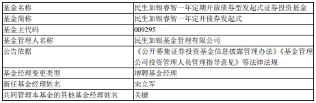 中国经济网北京10月10日讯 今日,民生加银基金公告,民生加银睿智一年定开债券发起式增聘宋立军。