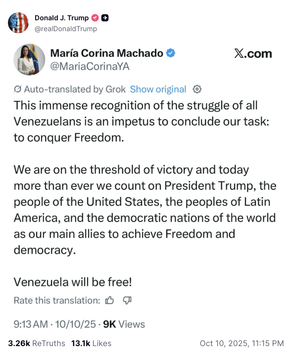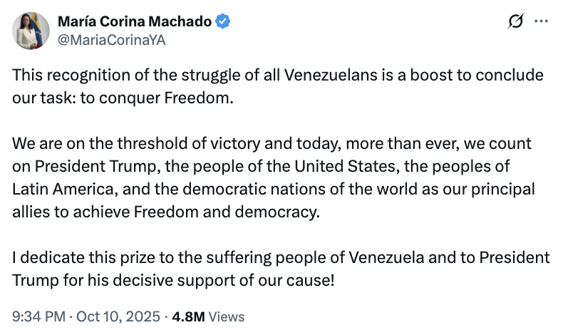 马查多写道:“对全体委内瑞拉人民抗争的认可将激励我们完成任务:赢得自由。我们正站在胜利的门槛上,此刻我们比以往任何时候都更依靠特朗普总统、美国人民、拉丁美洲人民以及全球民主国家作为我们的主要盟友,共同实现自由和民主。我谨将此奖献给饱受苦难的委内瑞拉人民,也献给特朗普总统,感谢他对我们事业的决定性支持!”