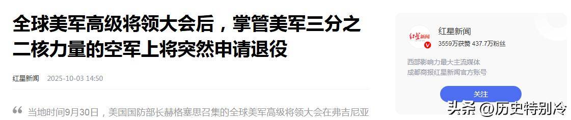 - 红星新闻:《全球美军高级将领大会后,掌管美军三分之二核力量的空军上将突然申请退役》,2025-10-03