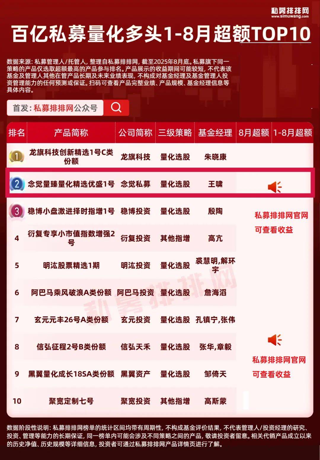 在私募排排网发布的百亿私募量化多头1-8月超额TOP10榜单中念觉私募王啸管理的“念觉量臻量化精选优盛1号”以***%的超额收益夺得第2。值得注意的是,该产品在8月份实现超额收益高达***%,在上榜产品中逆市领衔。