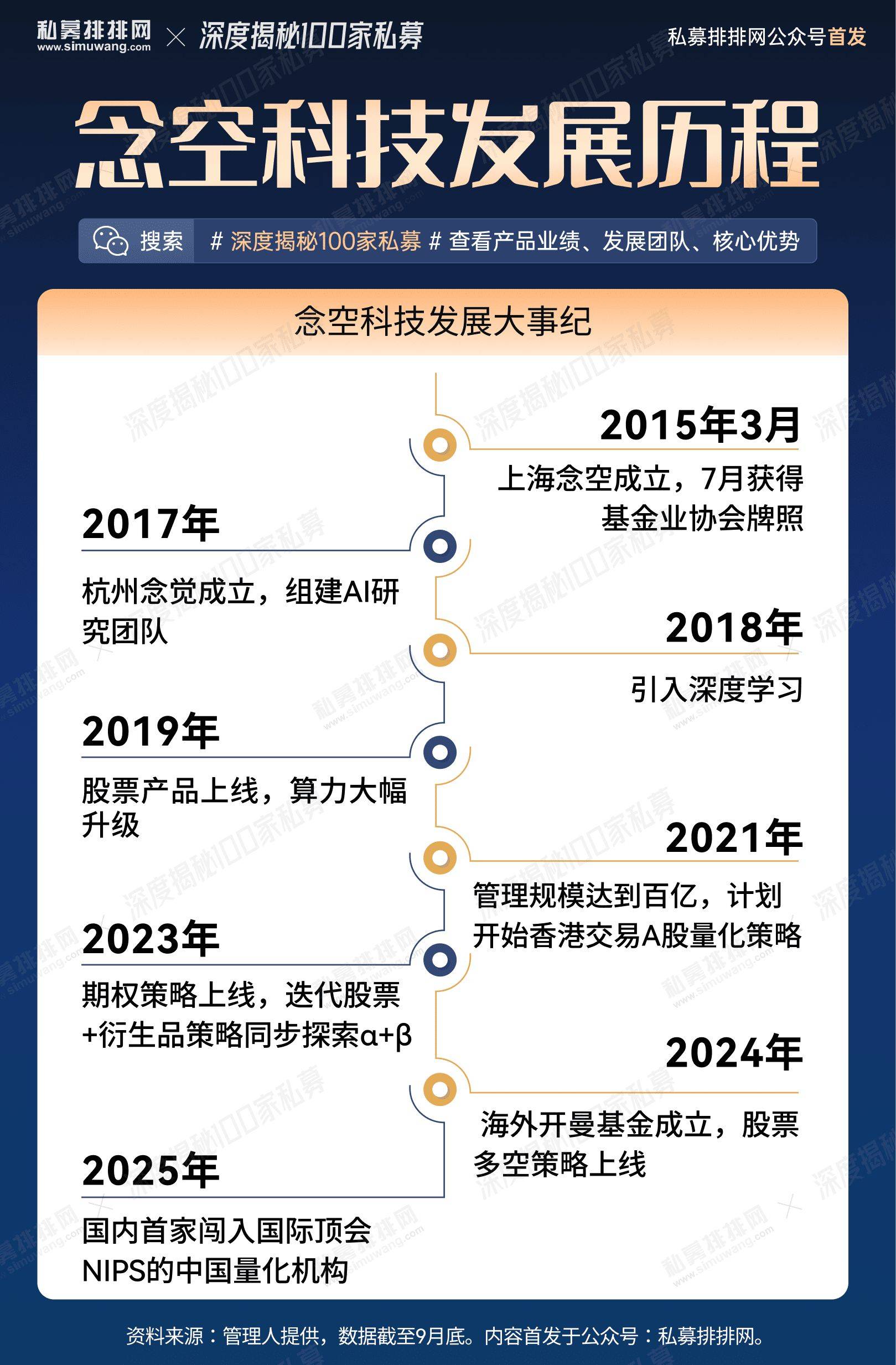 公司致力于运用科学的数据分析方法为投资人提供高质量的绝对收益产品。公司在2018年5月机器学习策略实盘开始运作,配备高性能GPU集群的服务器,使团队算力得到充分保障。截至2025年9月,念空深度学习为主的机器学习算法已经全面替代传统统计套利策略,应用于全部股票策略产品中。念空的优势在于人工智能领域较早的深入研究,为深度学习高频阿尔法选股策略提供了更稳定更高的超额收益来源。