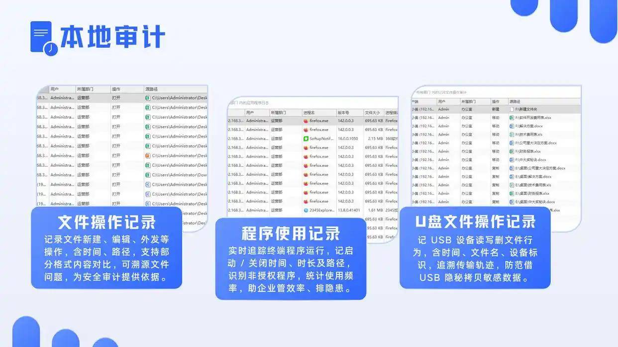全行为审计追踪:记录文件操作日志(如创建、访问、删除),结合敏感词报警功能,实时拦截通过微信、邮件等渠道外发机密信息的行为。