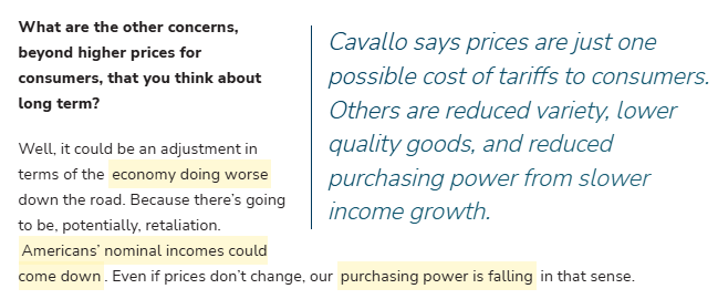 长期而言,关税可能削弱美国经济效率,使国内商品价格相对国际水平持续偏高。卡瓦洛认为,持续的关税政策可能令经济形势进一步恶化,美国人的名义收入将下降——即便物价不变,实际购买力也会随之下滑。