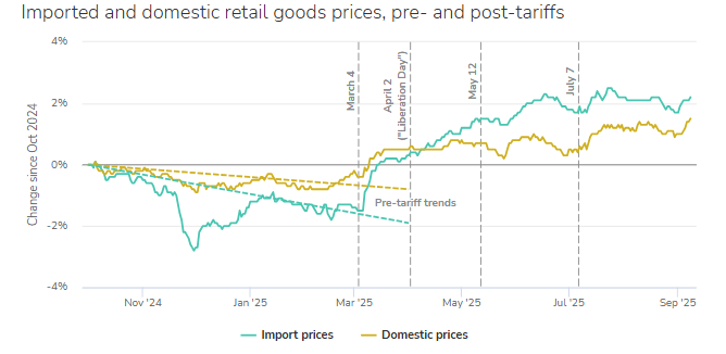 2024年10月以来,美国进口和国内商品零售价格走向趋势图