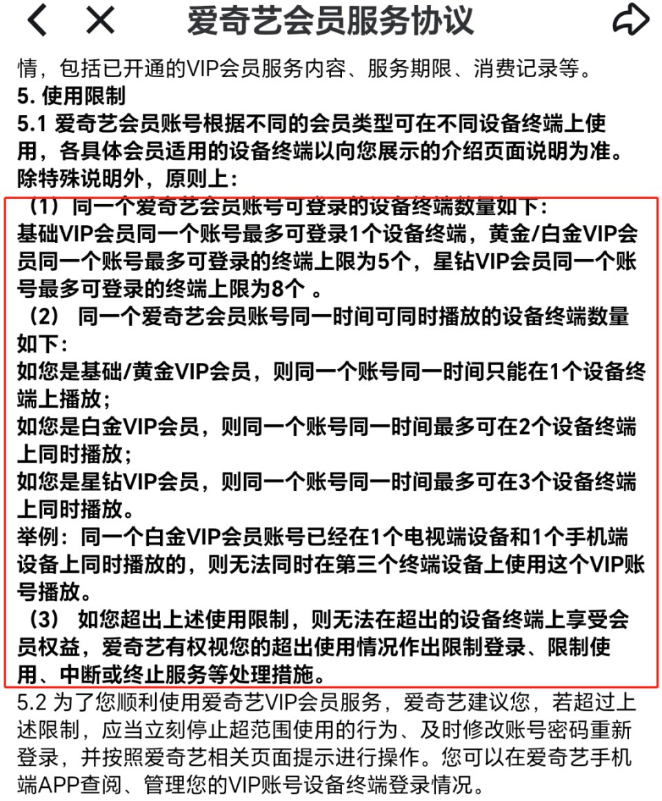 倘若用户超出使用限制,优酷建议用户关闭其他设备上的视频播放,以及及时修改密码并重新登录。爱奇艺平台协议则指出,平台将有权作出限制登录、限制使用、中断或者终止服务等措施。