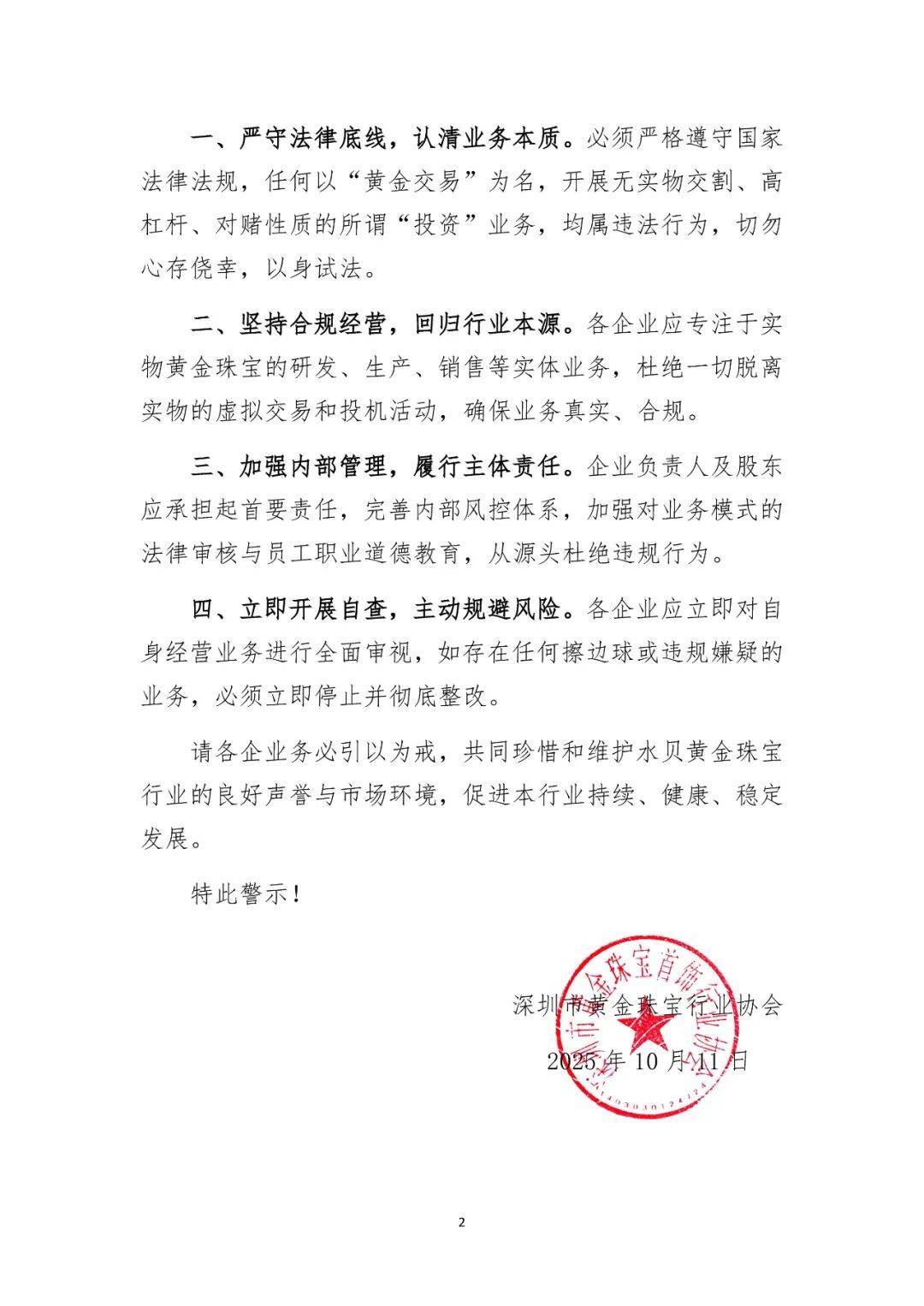 警示函称,“近期我们依然遗憾地注意到司法机关在深圳水贝片区相继查处了三家黄金珠宝公司。经查,这些公司以经营黄金为名,实际通过线上平台开展‘非实物黄金对赌’业务,其行为已涉嫌构成开设赌场罪。”