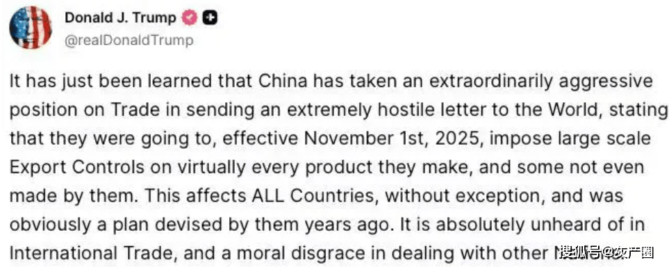 就在当地时间10月10日,美国总统特朗普愤怒的在“真相社交”(Truth Social)发表了一则措辞十分激进的帖子,称将对中国加征100%的关税,并对关键软件产品实施新的出口管制。
