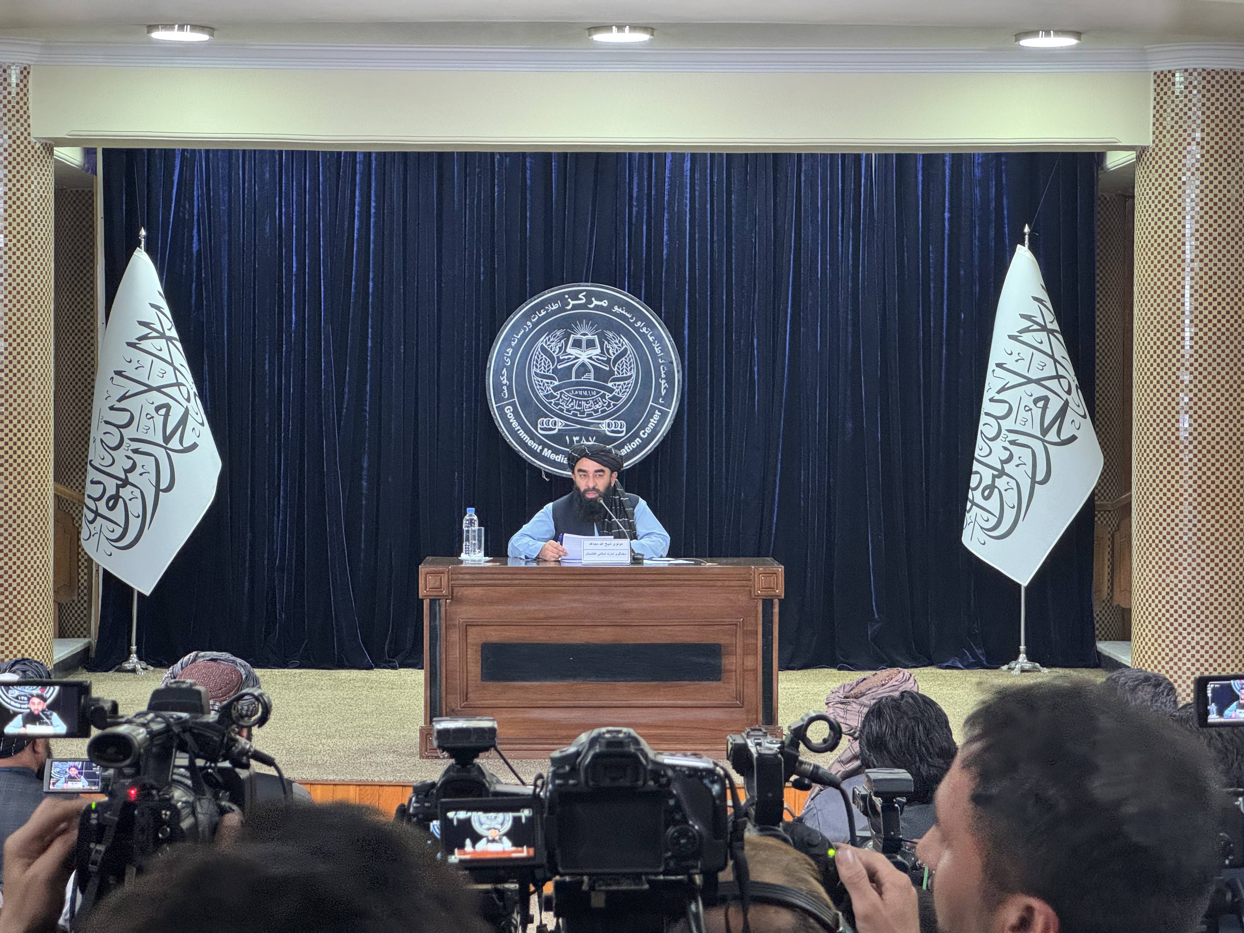 10月12日,阿富汗政府发言人扎比乌拉·穆贾希德在首都喀布尔举行的记者会上发言。 新华社记者 李昂 摄