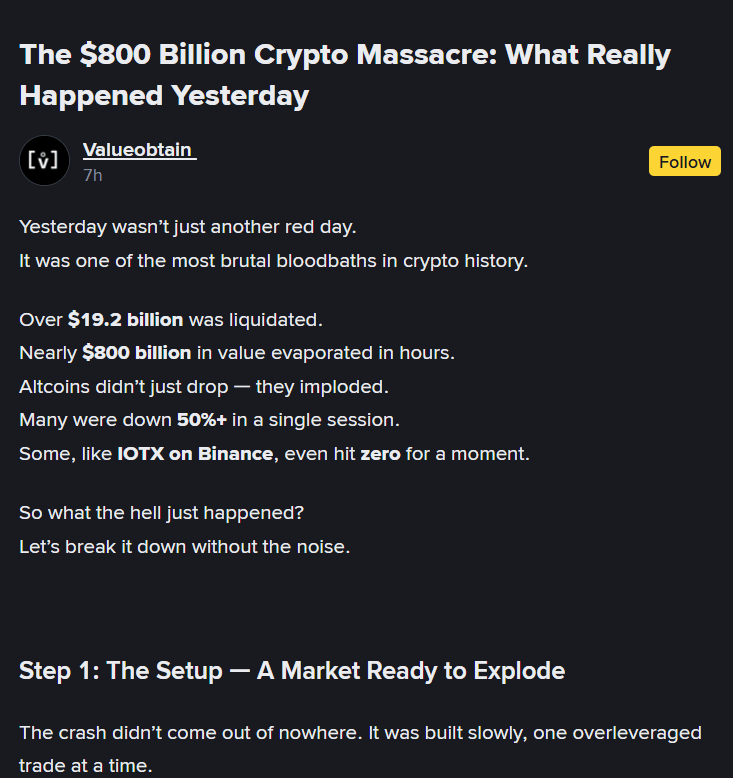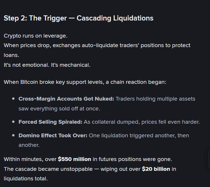 根据币安广场上一篇广为流传的帖子分析,这次崩盘并非毫无征兆,而是在一个高度杠杆化的市场环境中缓慢酝酿的。