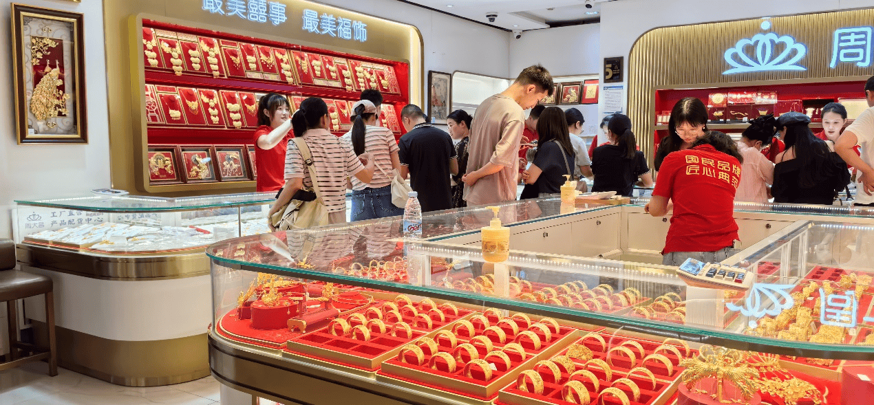 在一家婚庆主题金店内,柜台前有不少前来询问和试戴产品的消费者。