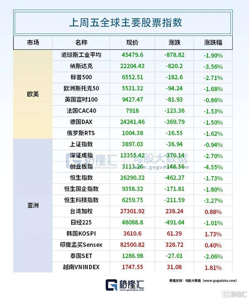 美股方面,道指周跌2.73%,纳指周跌2.53%,标普500指数周跌2.43%。大型科技股全线下跌,苹果周跌近5%,特斯拉、谷歌周跌超3%,英伟达周超2%,亚马逊、微软周跌超1%,Meta周跌0.74%.