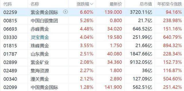 格隆汇10月13日|中美经贸博弈再度升级,避险资金推动金价重新上涨,现货黄金今日盘中再创历史新高价4060美元/盎司。金价上涨带动港股市场黄金股逆势走强,其中,紫金黄金国际涨超6%,中国白银集团涨超5%,赤峰黄金(600988)、灵宝黄金涨超4%,珠峰黄金涨超3%,山东黄金(600547)、紫金矿业(601899)、集海资源、潼关黄金涨超2%。