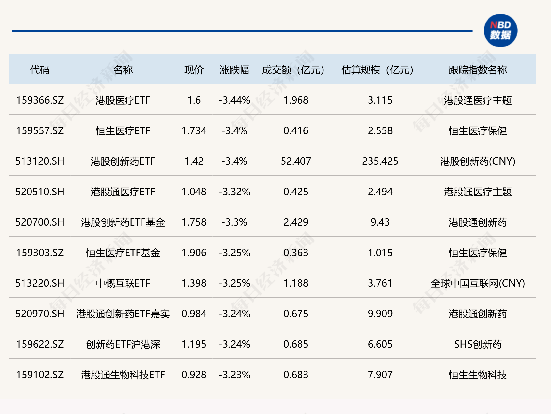 下跌方面,多只港股医疗相关ETF跌超3%。