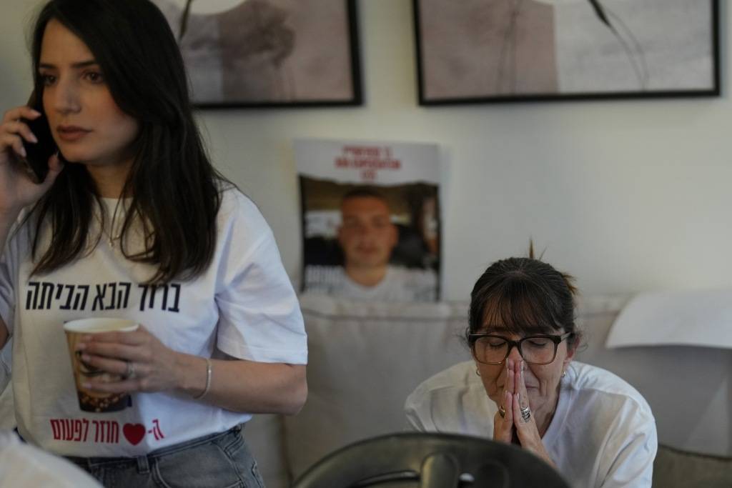 10月13日,以色列霍隆,以色列人质巴尔·库珀斯坦的家人和朋友观看加沙地带哈马斯释放人质的直播。