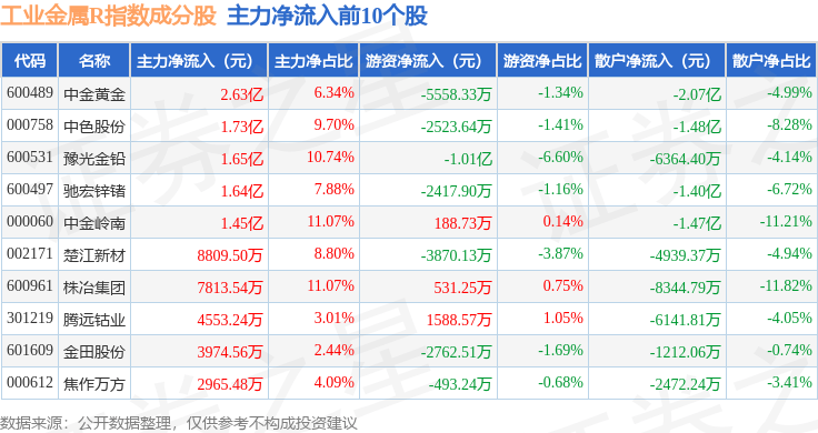 资金流向方面,工业金属R(480043)指数成份股当日主力资金净流出合计19.53亿元,游资资金净流入合计9.51亿元,散户资金净流入合计10.02亿元。成份股资金流向详情见下表: