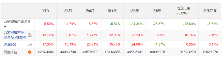 以万家健康产业基金为例,这只成立超过五年的产品,至今累计亏损高达-25.60%,近3年收益为 -24.34%,更是跑输基准超过49个百分点,市场排名垫底。该基金近1年还是亏损的5.57%。