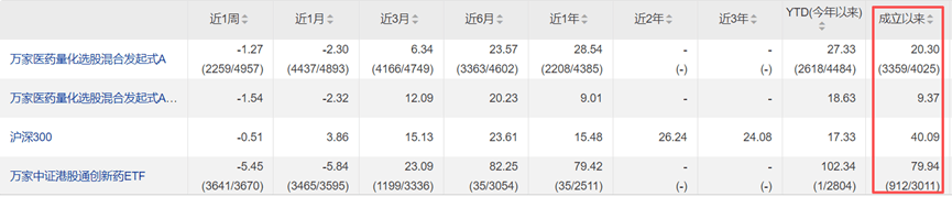另一只医药主题基金——万家医药量化选股混合发起式A,表现虽略好,但同样无法令人满意。其成立以来的收益为,尽管跑赢了基准,但大幅跑输沪深300指数20个百分点。