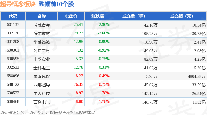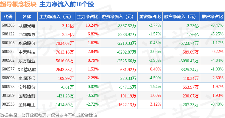 从资金流向上来看,当日超导概念板块主力资金净流出8827.54万元,游资资金净流出6837.57万元,散户资金净流入1.57亿元。超导概念板块个股资金流向见下表: