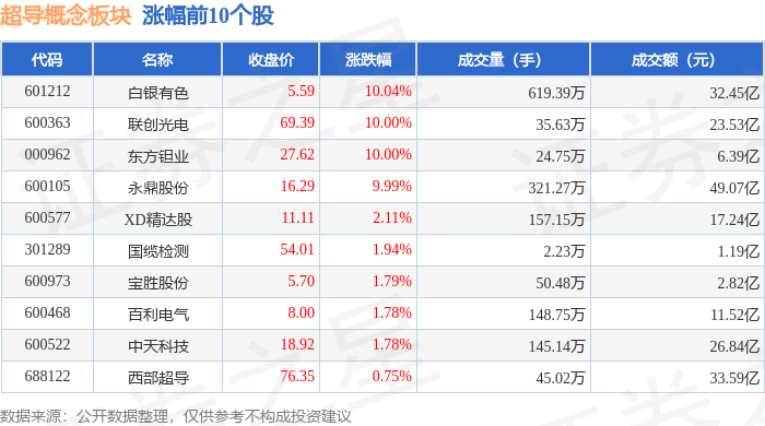 证券之星消息,10月13日超导概念板块较上一交易日上涨2.98%,白银有色领涨。当日上证指数报收于3889.5,下跌0.19%。深证成指报收于13231.47,下跌0.93%。超导概念板块个股涨跌见下表: