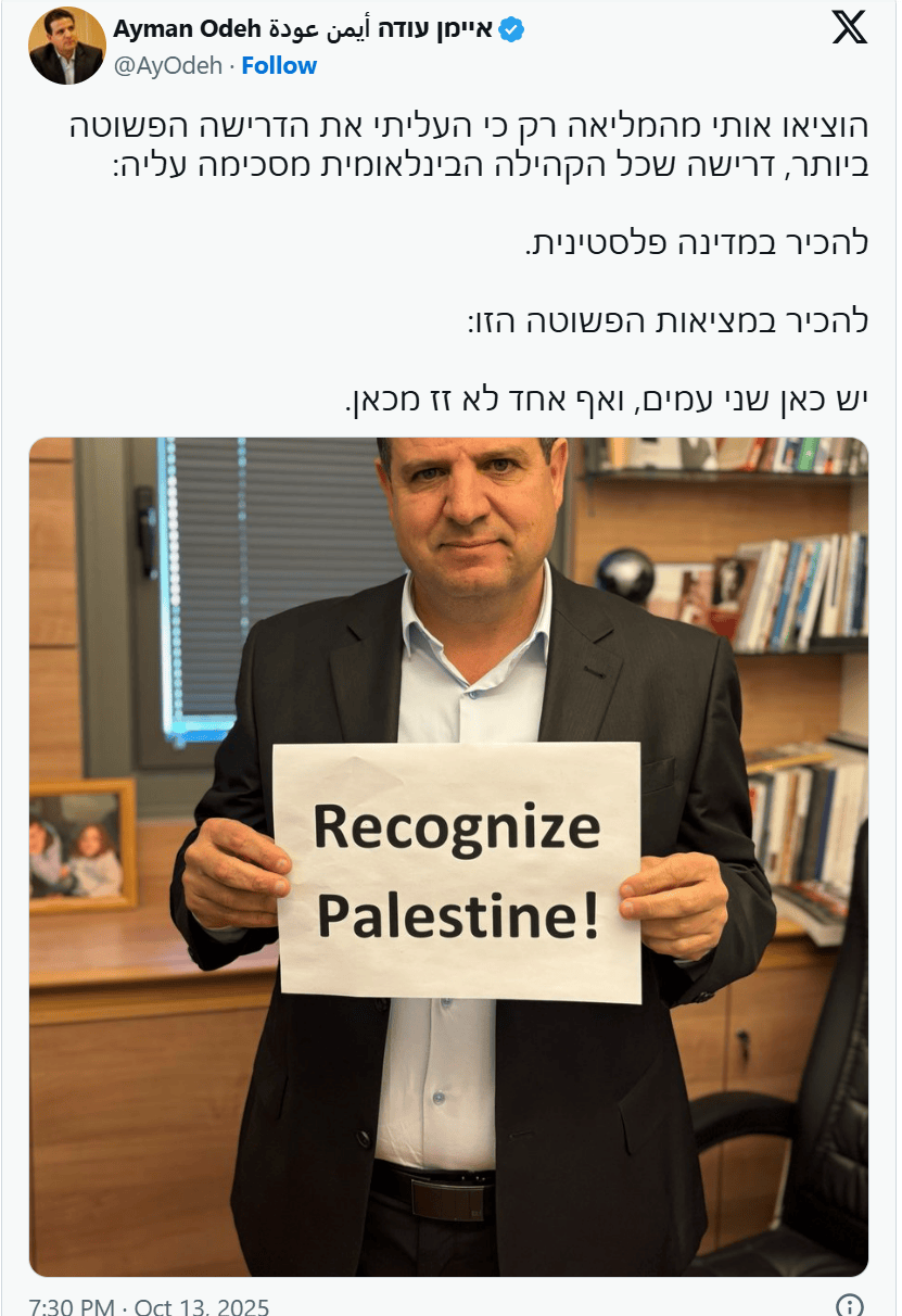 艾曼·奥德在社交平台发布自己手举“承认巴勒斯坦”标语的照片,并配文:他们把我赶出议会,只因为我提出了最简单的、整个国际社会都同意的要求:承认巴勒斯坦国。承认这个简单的事实:这里有两个民族(人民),谁也不会从这里离开。