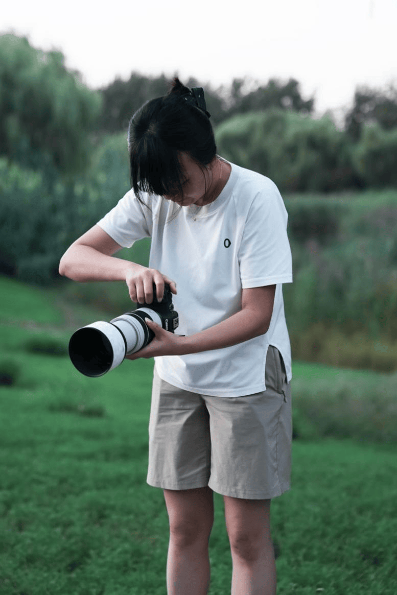 长焦带来的空间压缩,让我能够构造极简的画面。当他站在一条小径前,远处是渐远的树木与天空,人物虽小,却因背景的扁平化而格外突出。那一刻,她不再是“被拍摄的孩子”,而是自然场景中的一个沉思者。