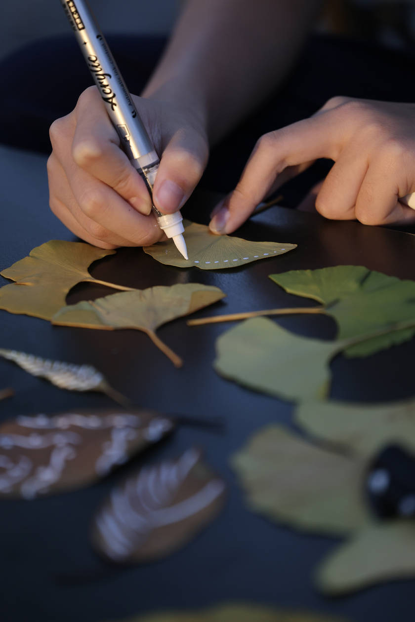 我尤其喜欢用200mm端配合F4光圈捕捉特写。逆光下的狗尾草绒毛清晰可见,孩子手握丙烯笔在银杏叶上画点画线,焦点落在她的指尖,这不是那种夸张的虚化,而是一种柔和的层次过渡——叶片纹理仍在,光斑轻盈却不乱,画面不至于甜腻,仍保留着自然的呼吸感。