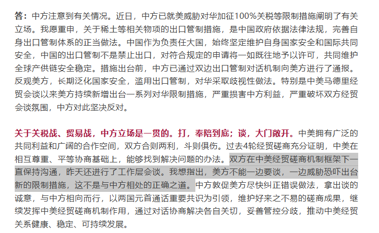 这番话,也通过中国商务部的表态得到验证,发言人最新答记者问,就提到中美一直在磋商机制下保持沟通,并举行了新一轮工作层会谈。