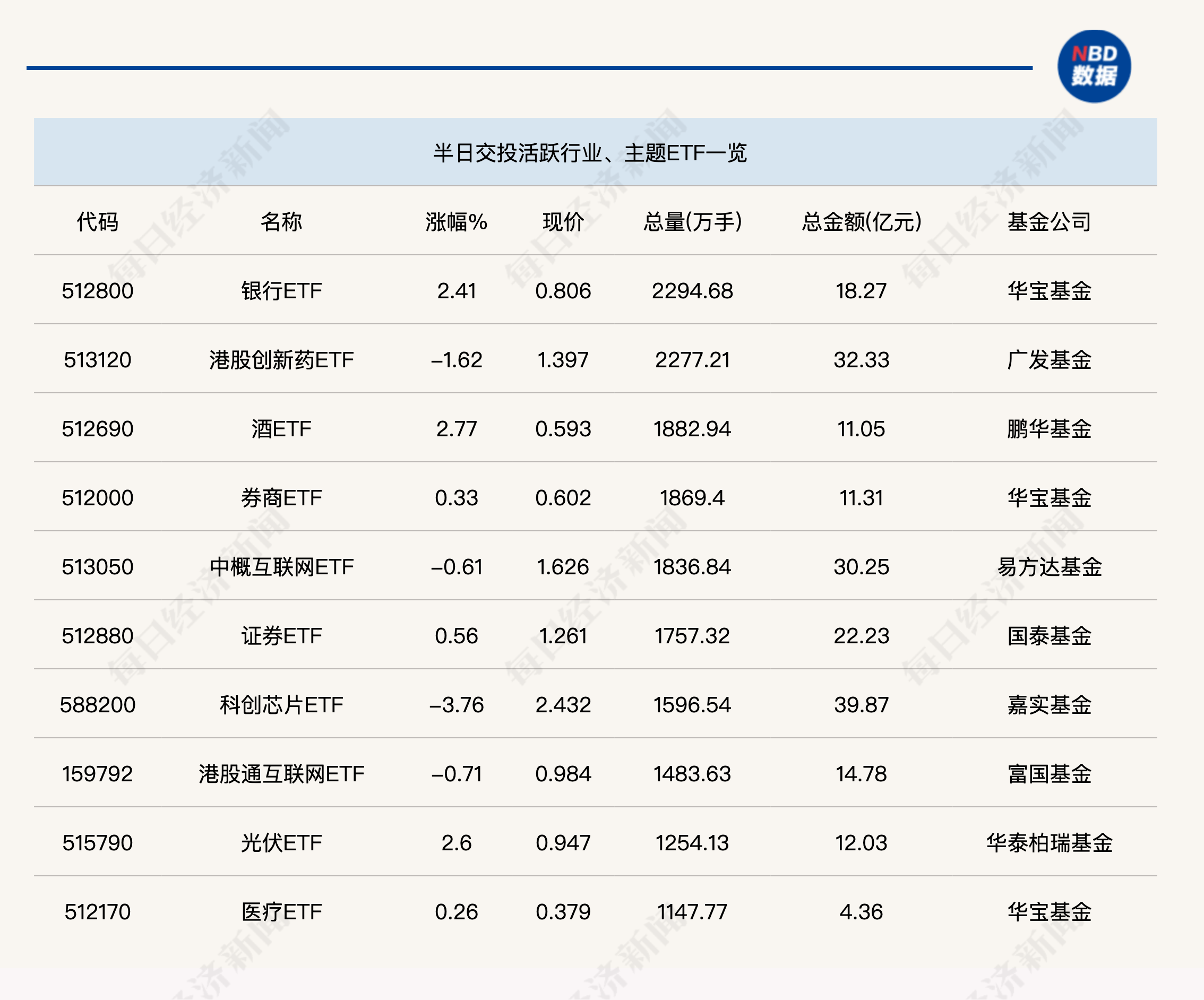 今日上午,金融、消费行业相关ETF交投活跃。其中,银行ETF(512800)半日成交总量达到2294.68万手,是半日交易量最大的行业类ETF;酒ETF(512690)半日成交金额也超过了10亿元,交易活跃度显著提升。