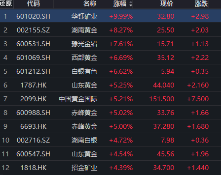 今日开盘,中证沪深港黄金产业股票指数(931238)强势上涨3.84%,成分股华钰矿业(601020)上涨9.99%,湖南黄金(002155)上涨8.27%,豫光金铅(600531)上涨7.61%,西部黄金(601069),白银有色(601212)等个股跟涨。