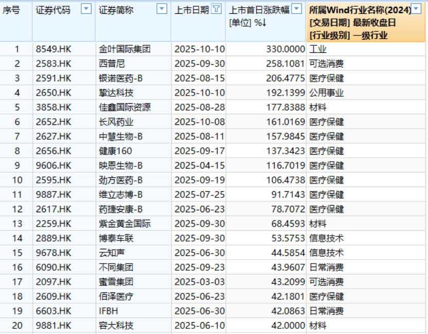 而在今年的港股新股市场,医疗保健公司的表现同样突出。在上市首日涨幅前20名的公司中,有9家是医疗保健公司,其中更有6家的涨幅是在100%以上。