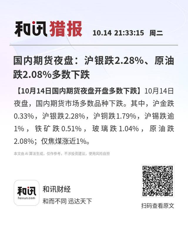 【10月14日国内期货夜盘开盘多数下跌】10月14日夜盘,国内期货市场多数品种下跌。其中,沪金跌0.33%,沪银跌2.28%,沪铜跌1.79%,沪锡跌逾1%,铁矿跌0.51%,玻璃跌1.04%,原油跌2.08%;仅焦煤涨近1%。