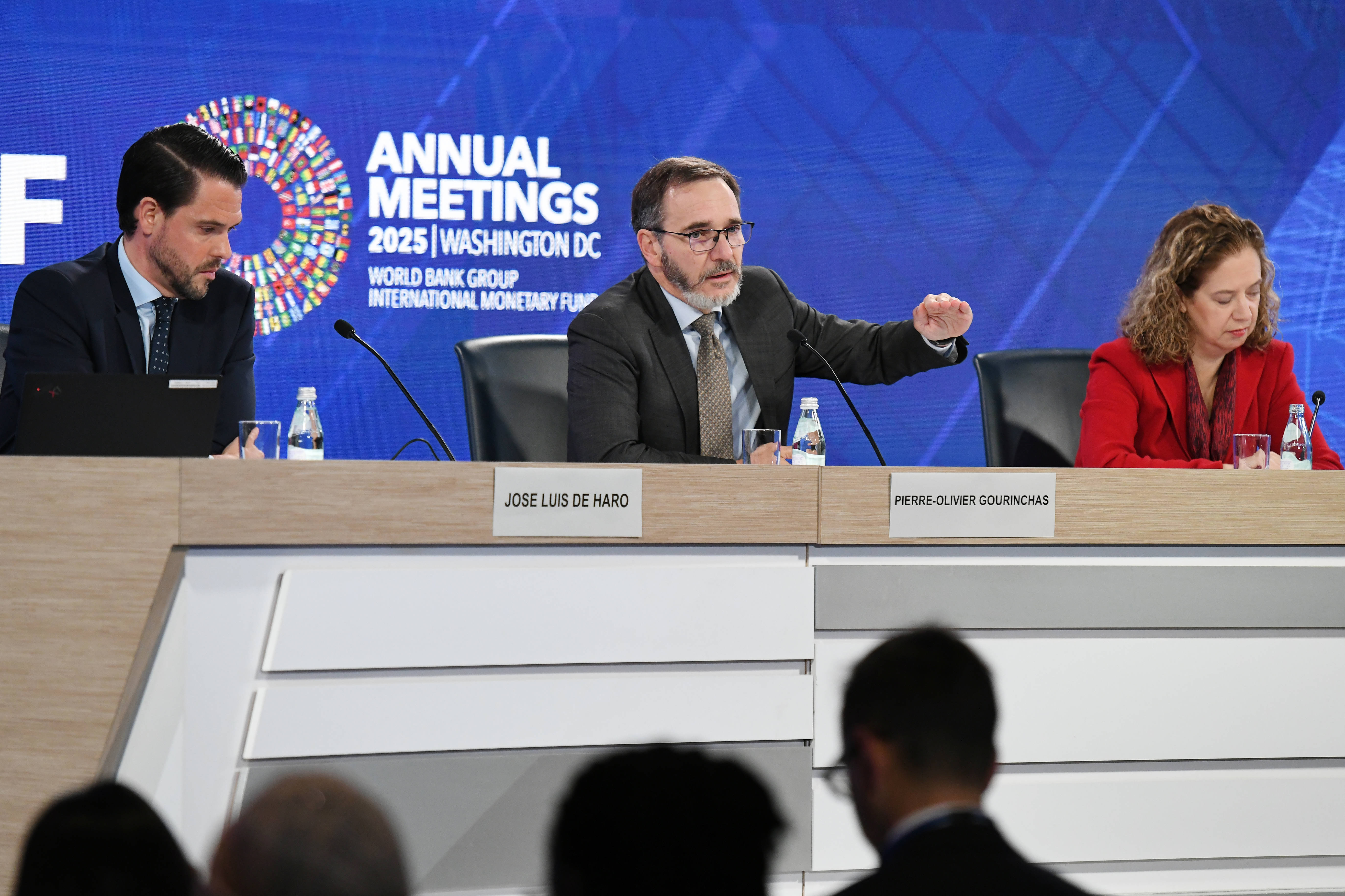 10月14日,在美国华盛顿,国际货币基金组织首席经济学家皮埃尔-奥利维耶·古兰沙(中)在《世界经济展望报告》新闻发布会上讲话。 新华社记者 李睿 摄